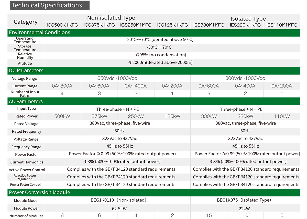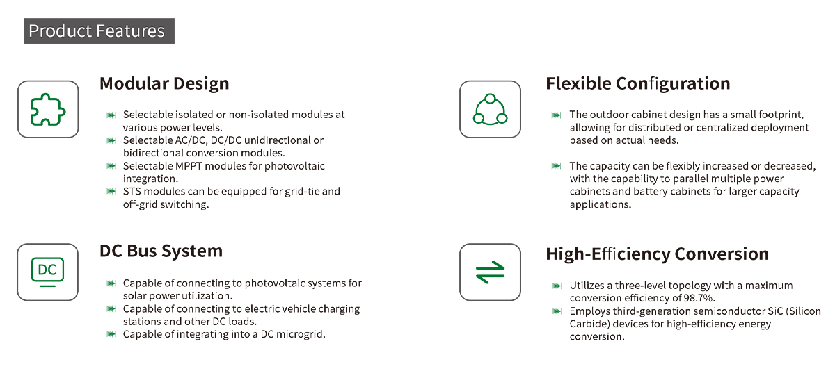 The energy storage power cabinet serves as the power conversion component of the energy storage system, integrating power distribution, conversion, and control. The system features a modular design, allowing for the selection of traditional non-isolated PCS or higher safety isolated bidirectional power conversion modules based on actual needs. It can also be configured with system power according to the application scenario or equipped with a photovoltaic MPPT module. The power cabinet is compact, easy to install, and convenient for distributed deployment.